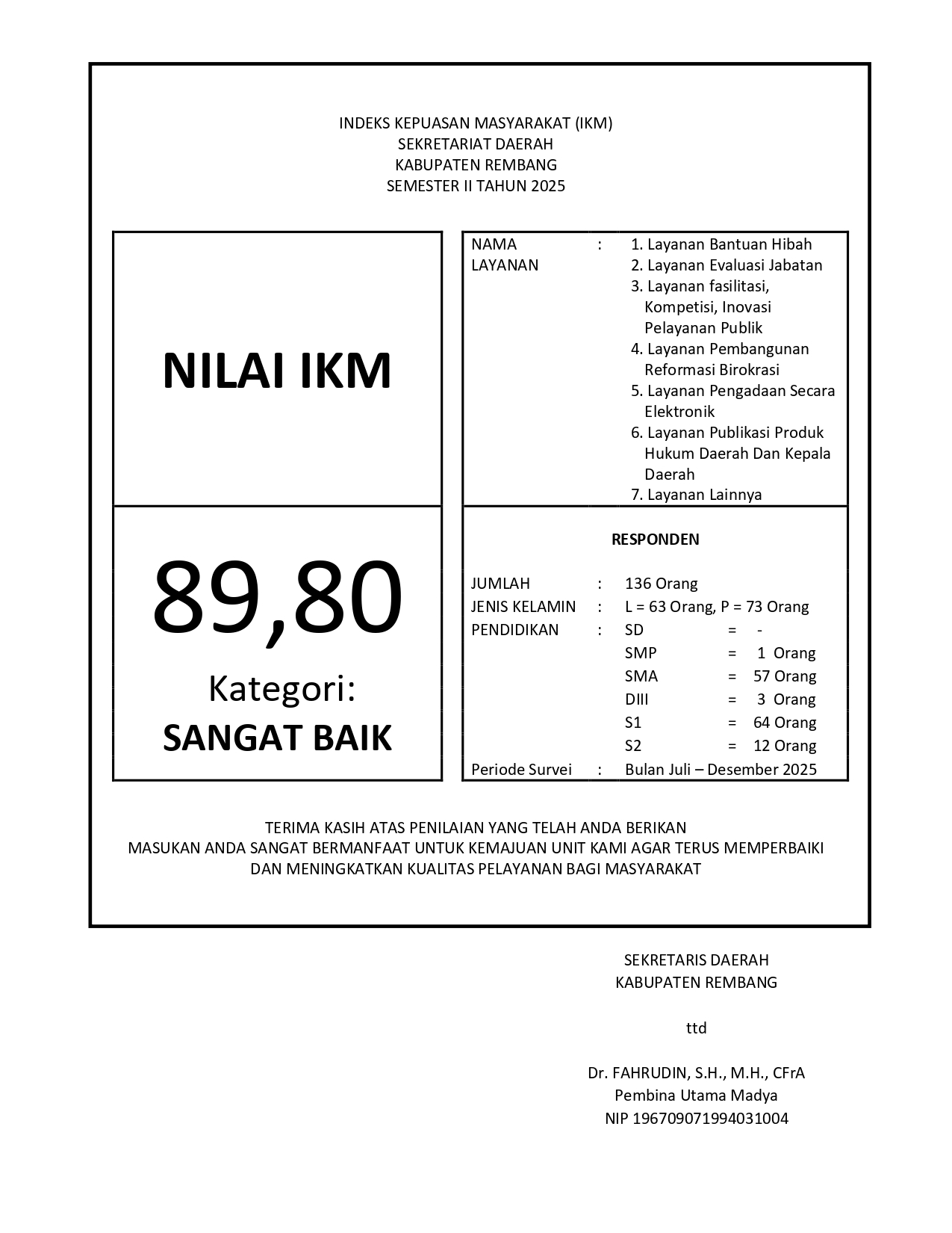 Hasil SKM 2 Jan 2024 By Admin Pemkab rembang | rembang | Pemerintahan 1 min read Share this Post Berikut hasil Standard Kepuasan Masyarakat (SKM) yang terangkum dalam dokumen Indeks Kepuasan Masyarakat (IKM) Sekretariat Daerah (Setda) Kabupaten Rembang.LAPORAN SKM SEMESTER I DAPAT DIUNDUH DI SINILAPORAN SKM SEMESTER I DAPAT DIUNDUH DI SINI 54 Tenaga Pendidik Rembang Duduki Jabatan Baru 228 Orang Dapatkan Bantuan BAZNAS Jateng
